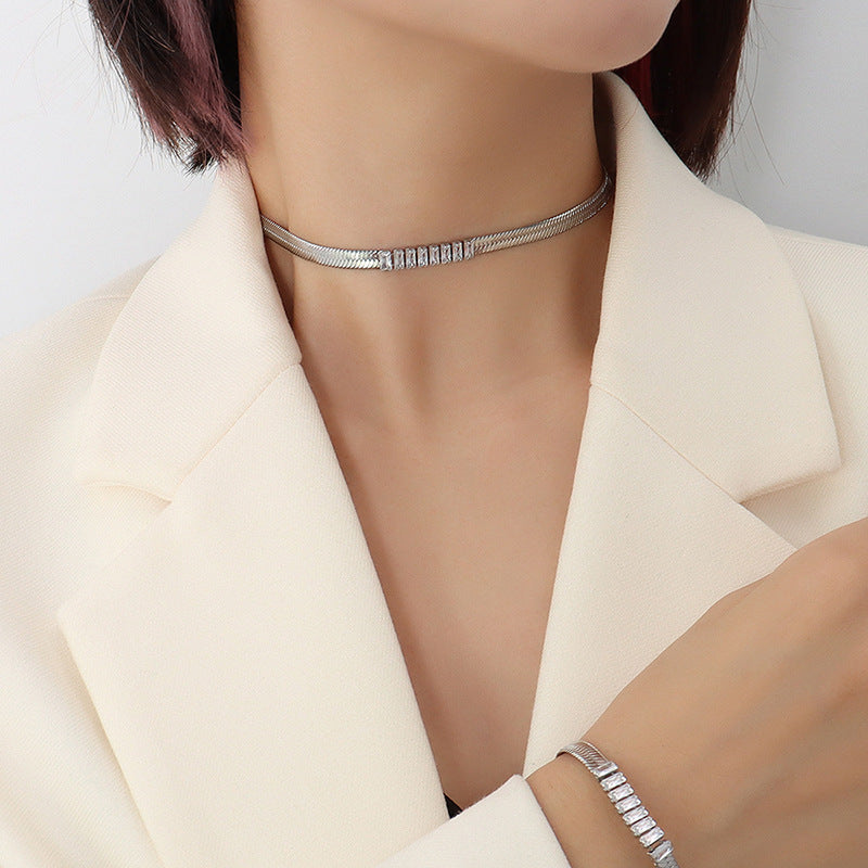 Colar Gargantilha e Pulseira em Aço Inoxidável e Zircônia