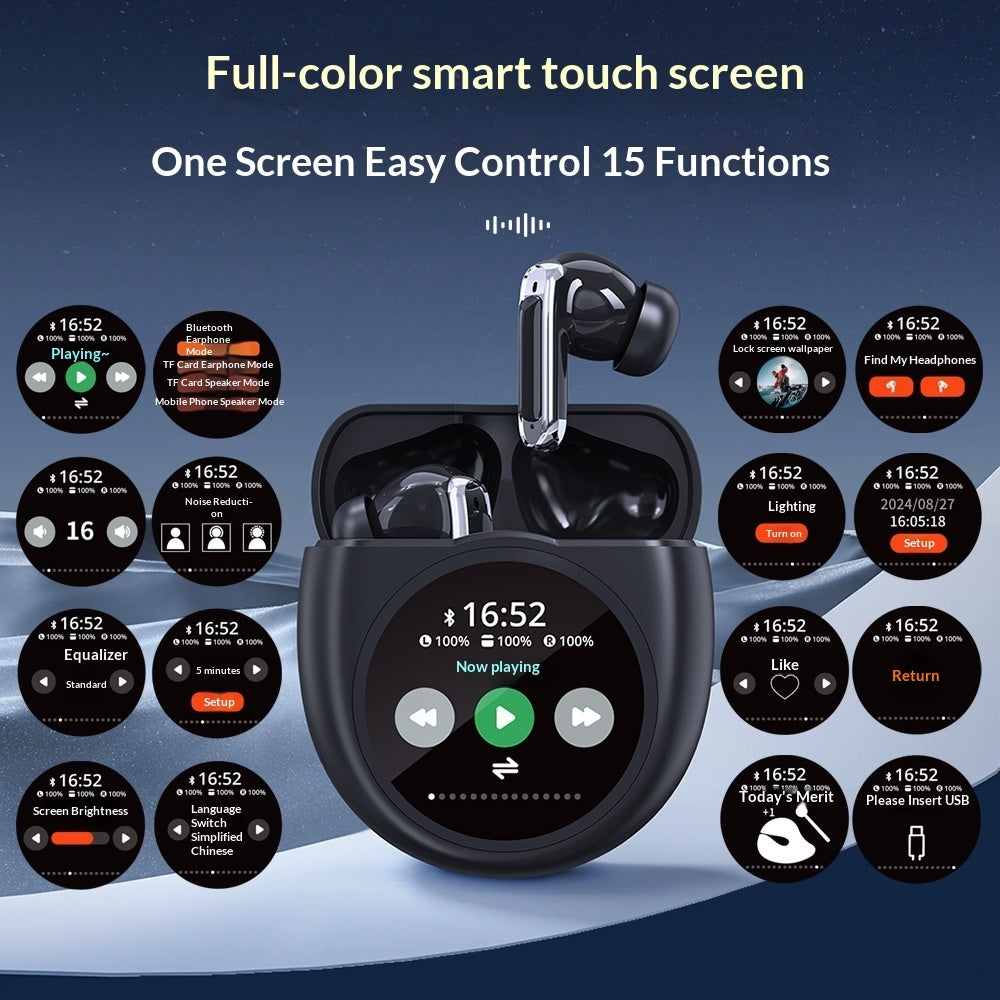 Estojo de carregamento equipado com ecrã tátil full HD de alta resolução, que permite controlar até 15 funções diretamente no ecrã, incluindo reprodução de música, equalizador, Bluetooth, cancelamento de ruído, brilho do ecrã, localização dos auriculares, papel de parede, bloqueio de ecrã e muito mais.