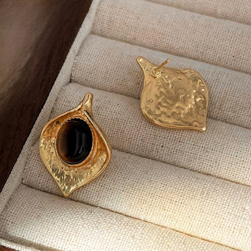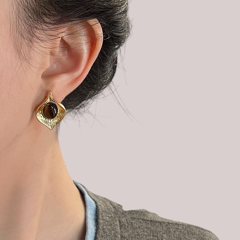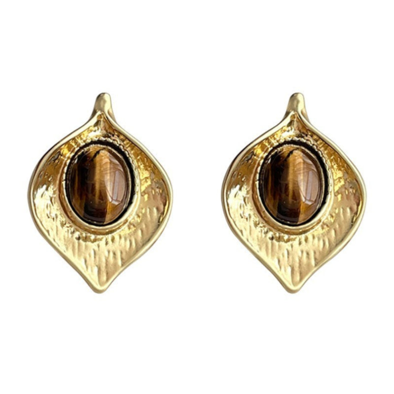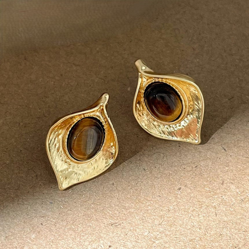 Estes brincos sofisticados destacam-se pelo seu design elegante em forma de folha e pela presença do Olho de Tigre, uma pedra natural conhecida pelas suas tonalidades únicas e simbolismo protetor. Com acabamento dourado e detalhes delicados, são ideais para quem aprecia acessórios com personalidade e um toque de inspiração vintage. Perfeitos para complementar visuais clássicos ou contemporâneos com um brilho natural e distinto.