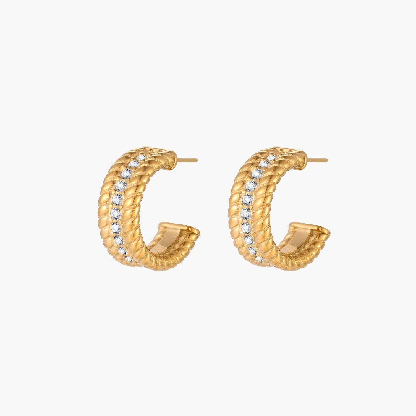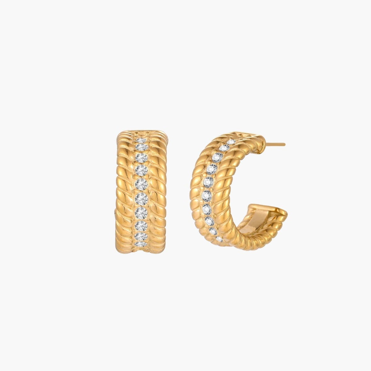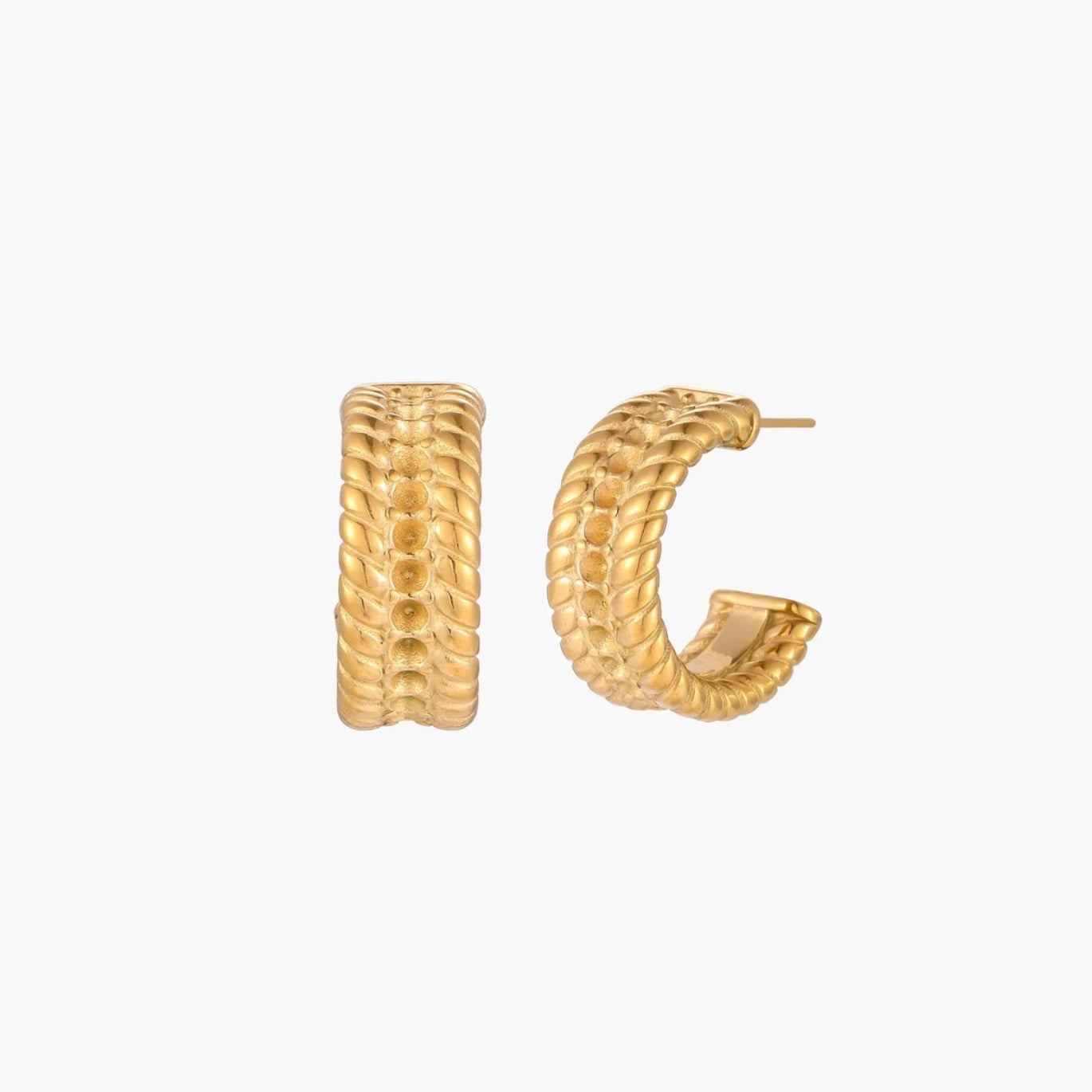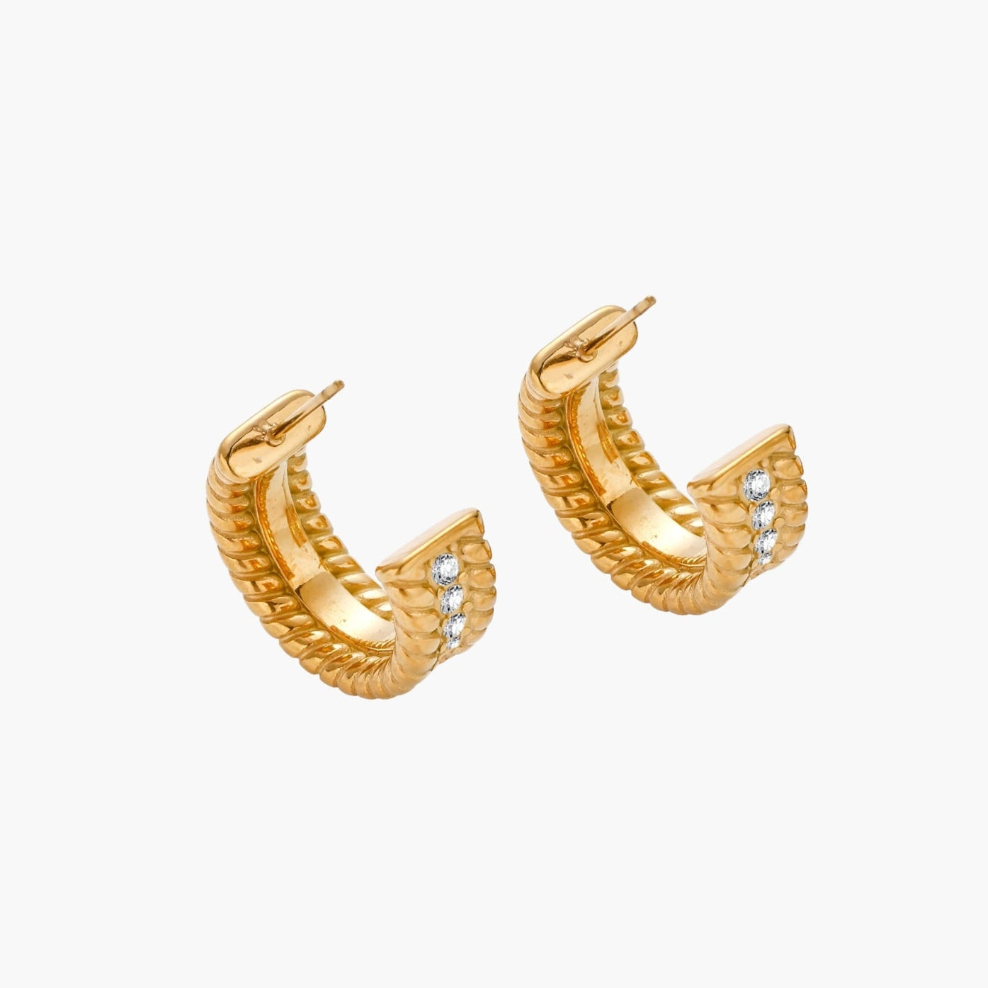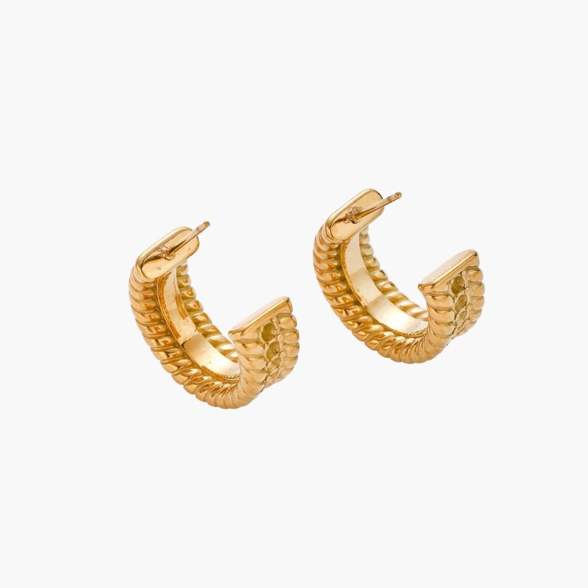 Argolas esculturais banhadas a ouro 14K com textura canelada que capta a luz de todos os ângulos. O design robusto e elegante transmite confiança e calor, tornando-se uma peça essencial para brunches, inaugurações de galerias ou para elevar o seu look diário com uma energia sofisticada e segura.
