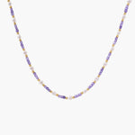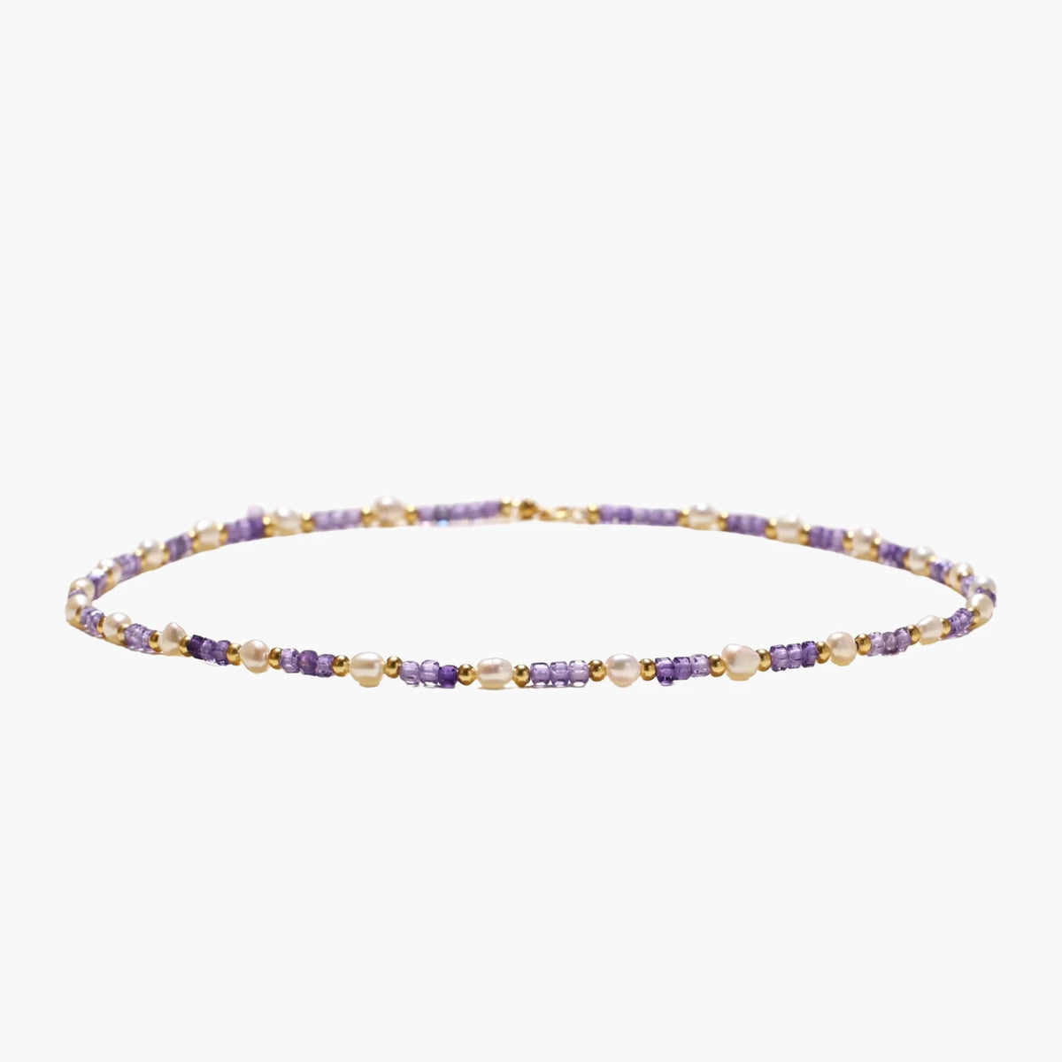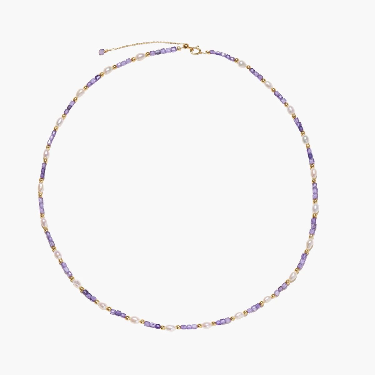 Zircónias em tom lavanda e pérolas luminosas, conhecidas por potenciar a energia feminina, dançam ao longo de um delicado colar de contas em ouro vermeil 18K, criando uma peça leve, sonhadora e sofisticada.