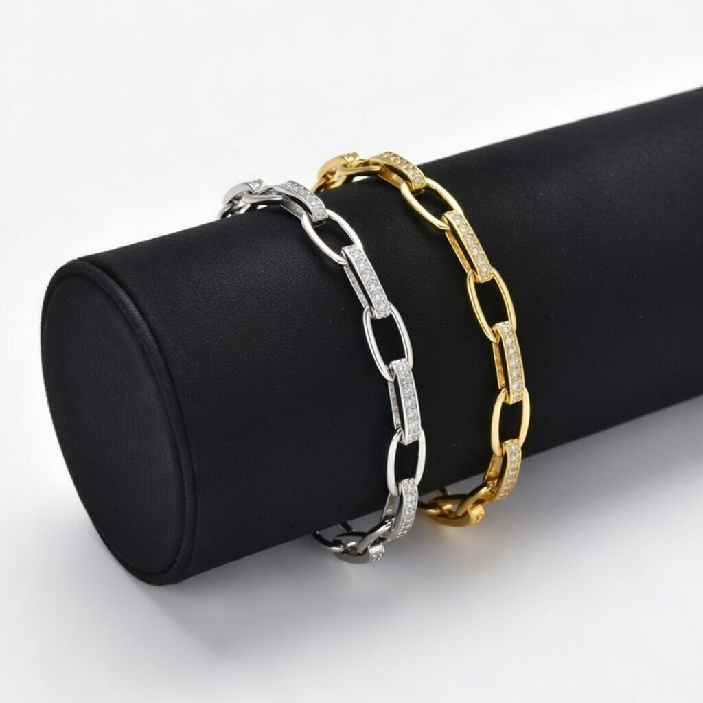 Imponente e sofisticada, a Pulseira Link Prestige combina o design moderno de elos com o brilho refinado das zircónias, criando uma peça elegante e cheia de presença. O seu estilo contemporâneo confere distinção e glamour ao pulso, tornando-a ideal tanto para ocasiões especiais como para elevar um look mais simples do dia a dia. Disponível em prateado ou dourado, é o acessório perfeito para mulheres que apreciam luxo discreto e detalhe requintado.