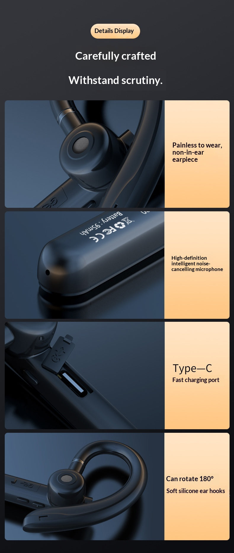 Design Over-Ear Ergonómico: Sistema sem inserção no ouvido, reduz a pressão auditiva e proporciona conforto superior mesmo após várias horas de uso. Gancho em silicone macio com rotação até 180° para ajuste perfeito à orelha.