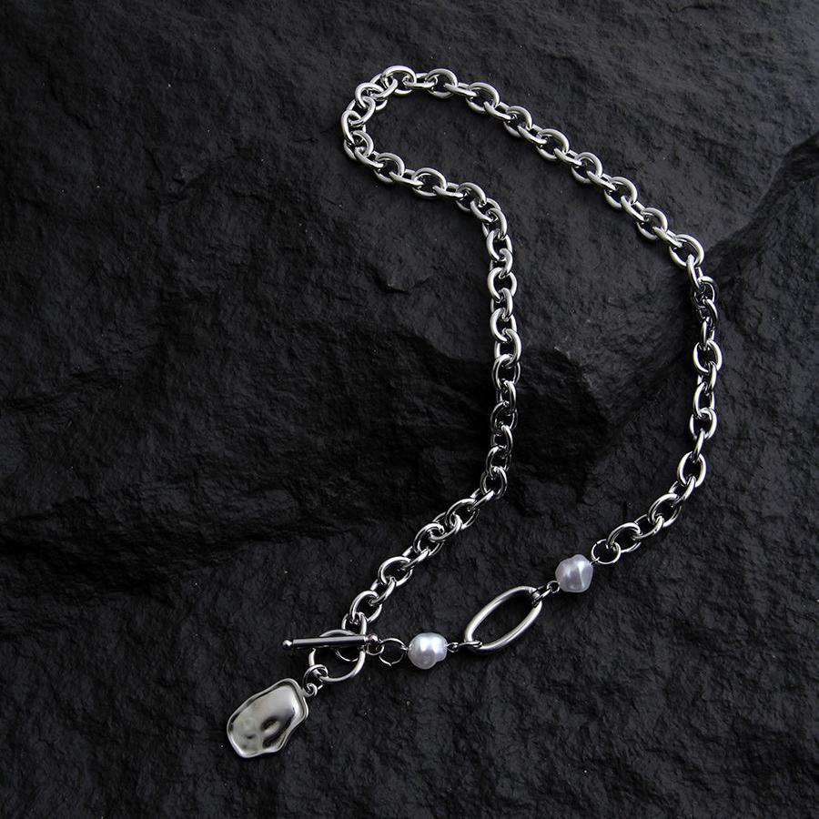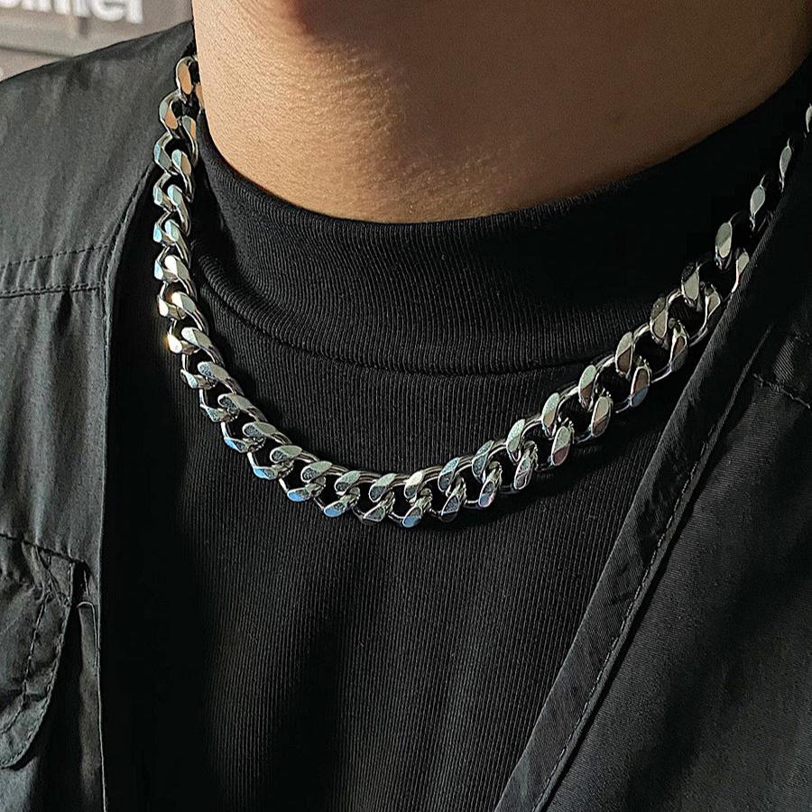 Su diseño robusto y moderno combina el sutil brillo del acabado plateado con la durabilidad del acero inoxidable, garantizando una pieza resistente al uso diario y de una presencia impactante. La cadena larga le aporta un toque atrevido.