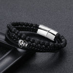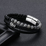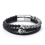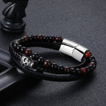 Esta pulseira Skull de couro e pedra natural é uma escolha elegante e versátil para qualquer ocasião. Possui fecho magnético e largura de 13 mm, com tamanho ajustável para um ajuste perfeito. Feita com couro e pedra natural de alta qualidade, está disponível em várias cores para se adequar ao seu estilo único.