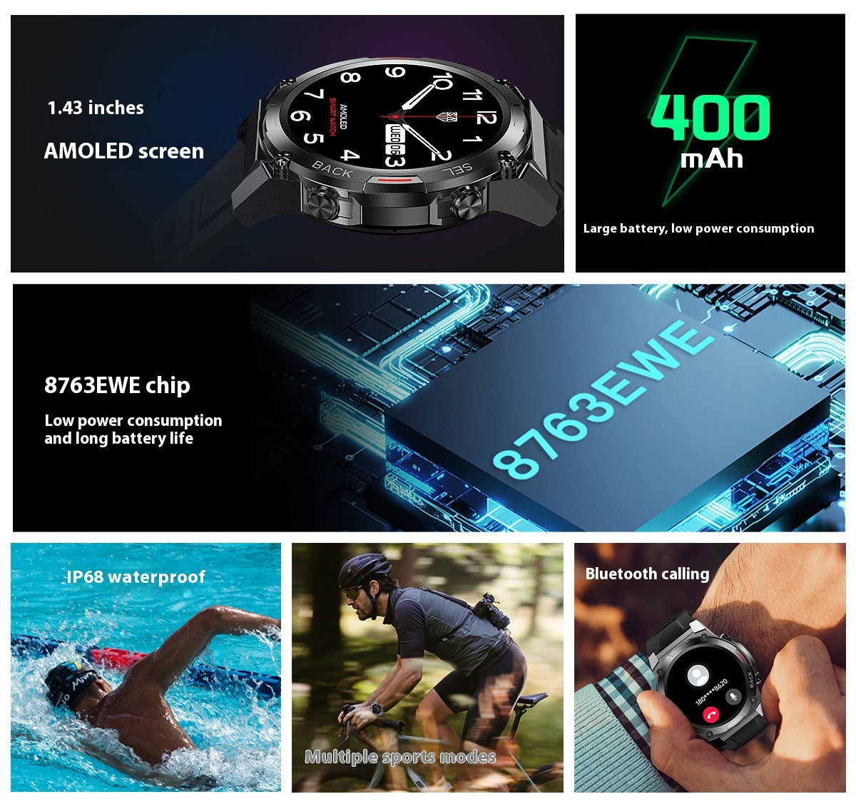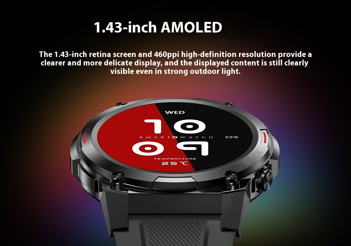 O ecrã AMOLED de 1.43” com resolução Retina oferece uma visualização clara e nítida mesmo sob luz intensa. A autonomia prolongada e a resistência à água IP68 fazem deste relógio uma escolha fiável para quem procura funcionalidade, durabilidade e estilo num único dispositivo.