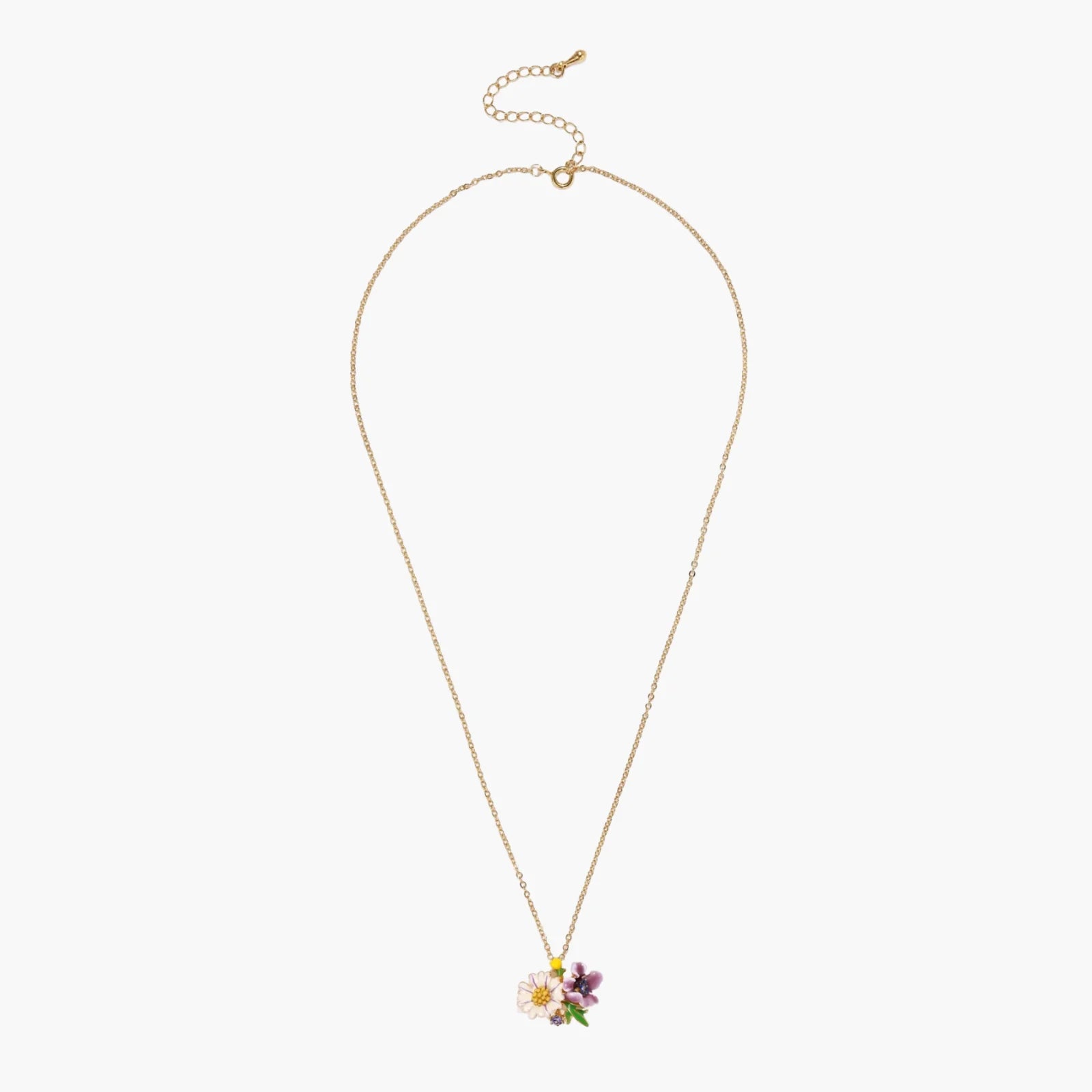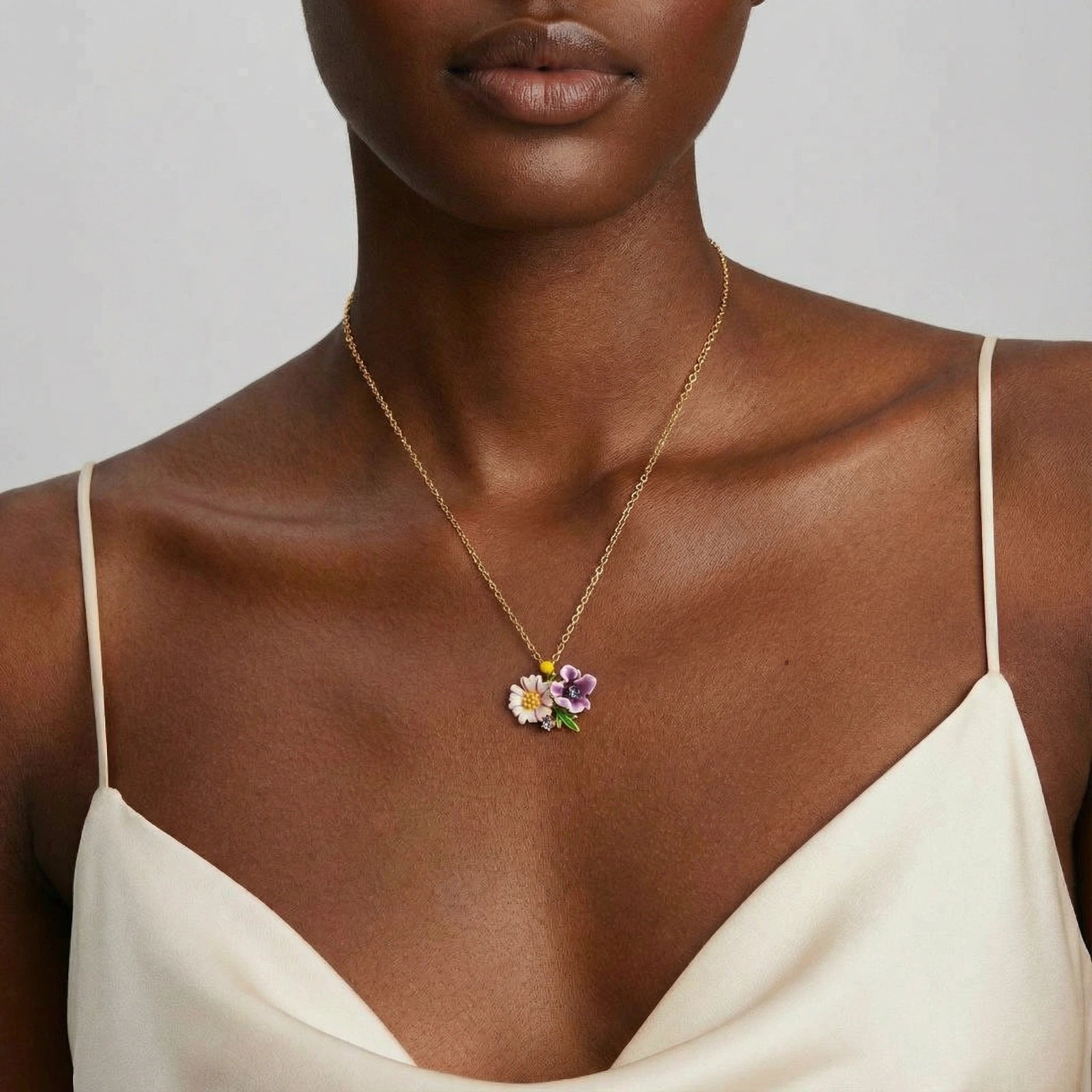 Flores pintadas à mão em esmalte, em tons suaves de rosa e lilás, capturam a energia dourada de um jardim ao pôr do sol.