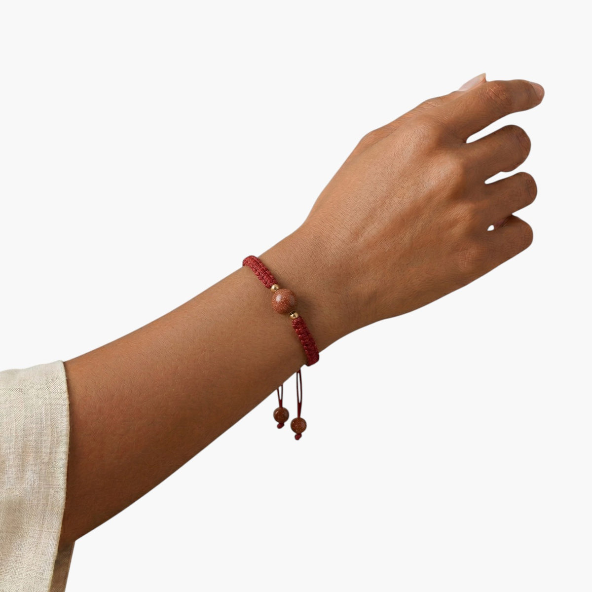 Adicione um toque de cor e estilo ao seu visual com esta elegante pulseira trançada em corda, realçada por contas de cinnabar vermelho. Ajustável e versátil, é perfeita para complementar looks casuais ou para oferecer como presente especial.