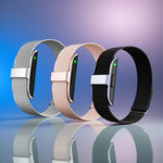 A Pulseira Inteligente de Saúde sem Ecrã alia a sofisticação de uma peça de joalharia à inovação da tecnologia de saúde, oferecendo monitorização contínua dos seus sinais vitais com máxima discrição. Leve, confortável e elegante, é ideal para quem valoriza bem-estar, estilo e praticidade no dia a dia, sem a presença de um ecrã visível.