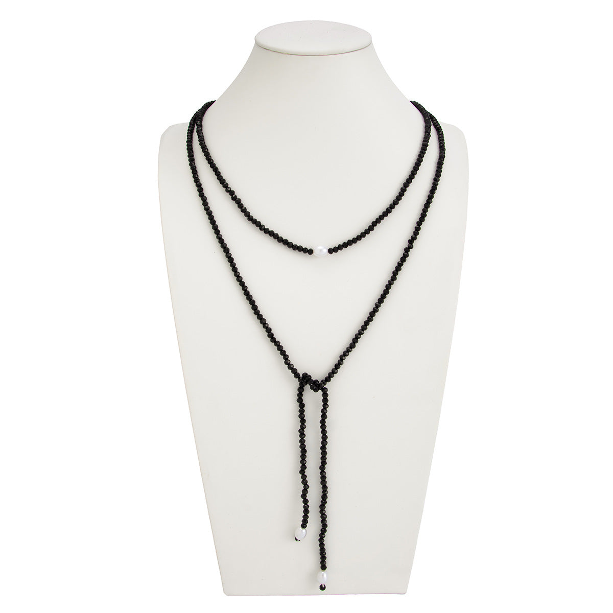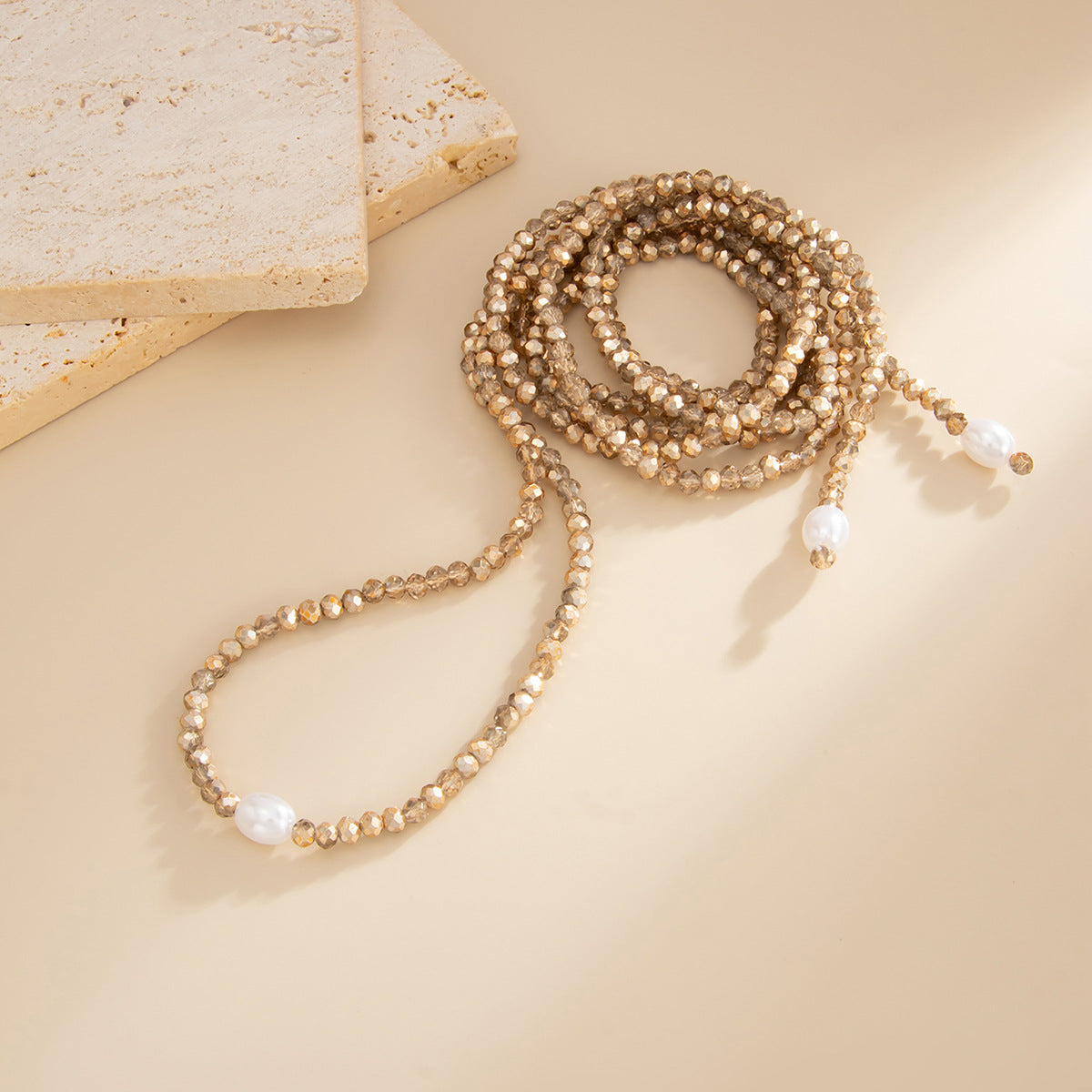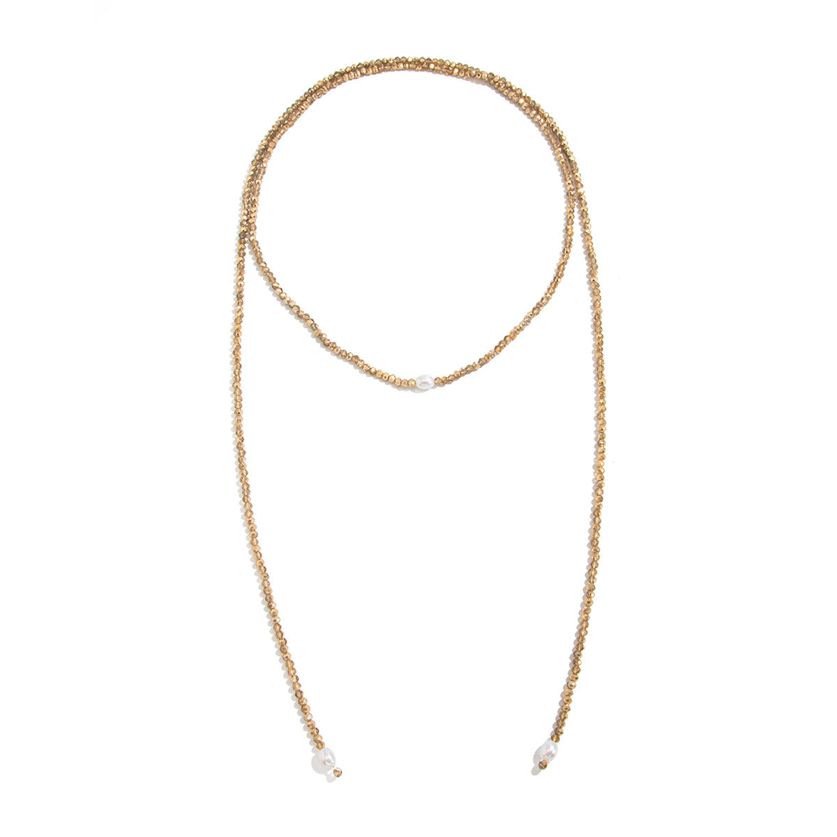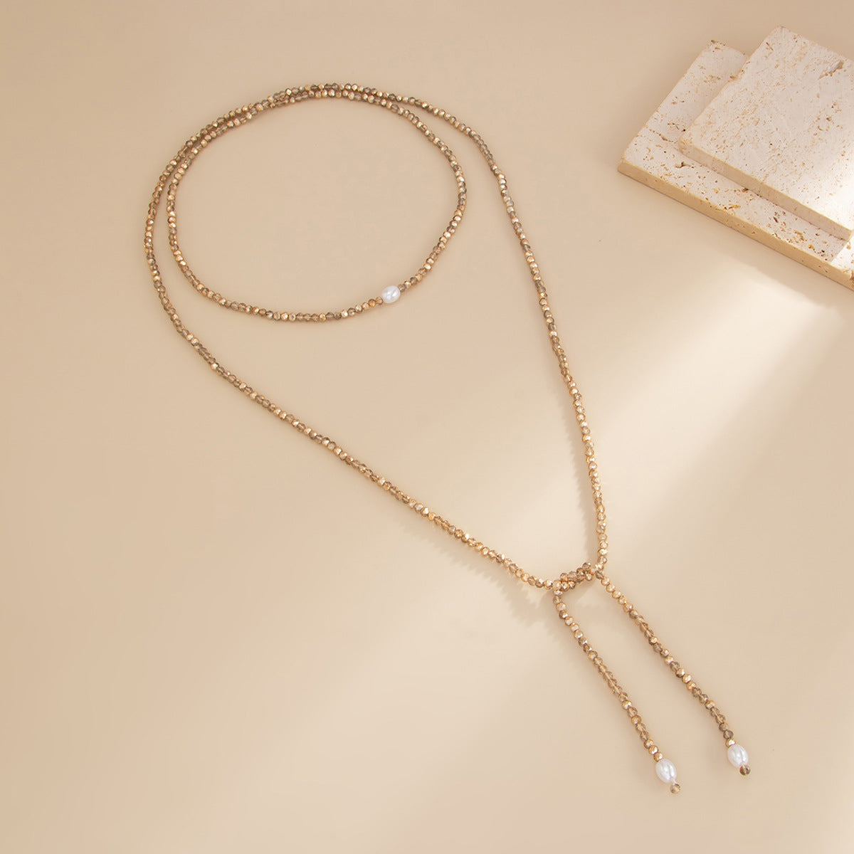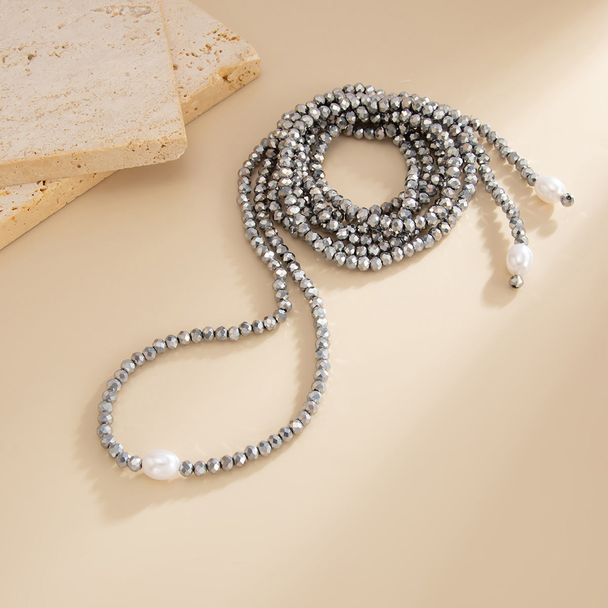 Este colar longo combina o brilho delicado do cristal com o toque clássico da pérola, criando um acessório elegante e versátil para complementar qualquer look. O seu comprimento generoso permite múltiplas formas de utilização, simples, duplo ou até em camadas com outras peças, tornando-o perfeito tanto para um estilo sofisticado como para um visual mais descontraído. Uma peça leve, cintilante e intemporal, ideal para transformar o dia a dia com um brilho subtil.