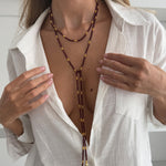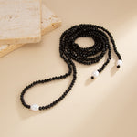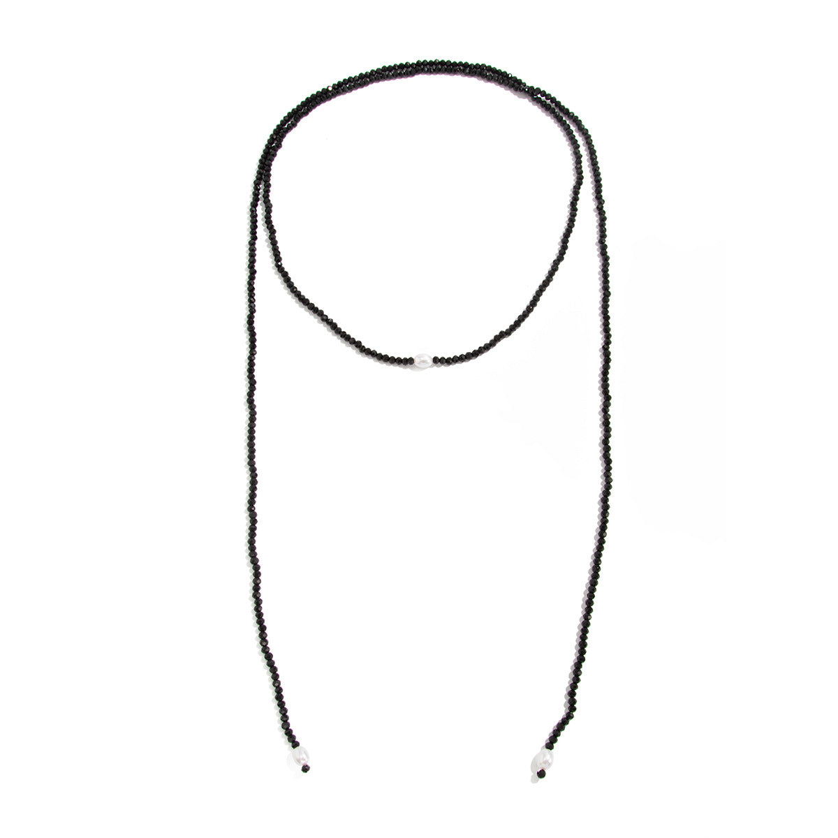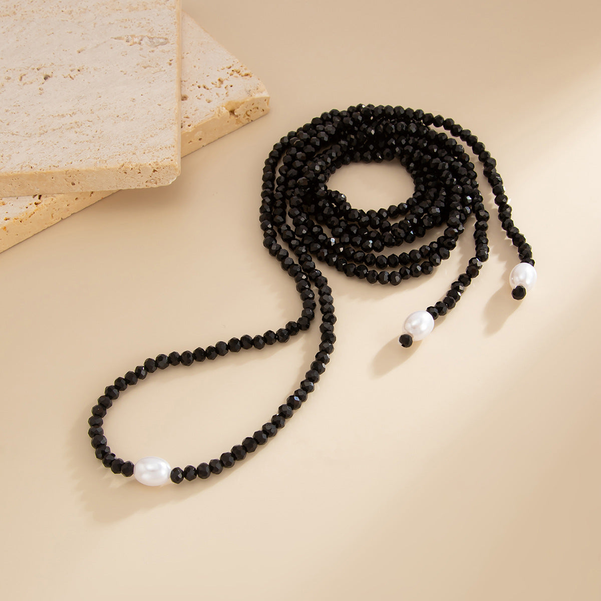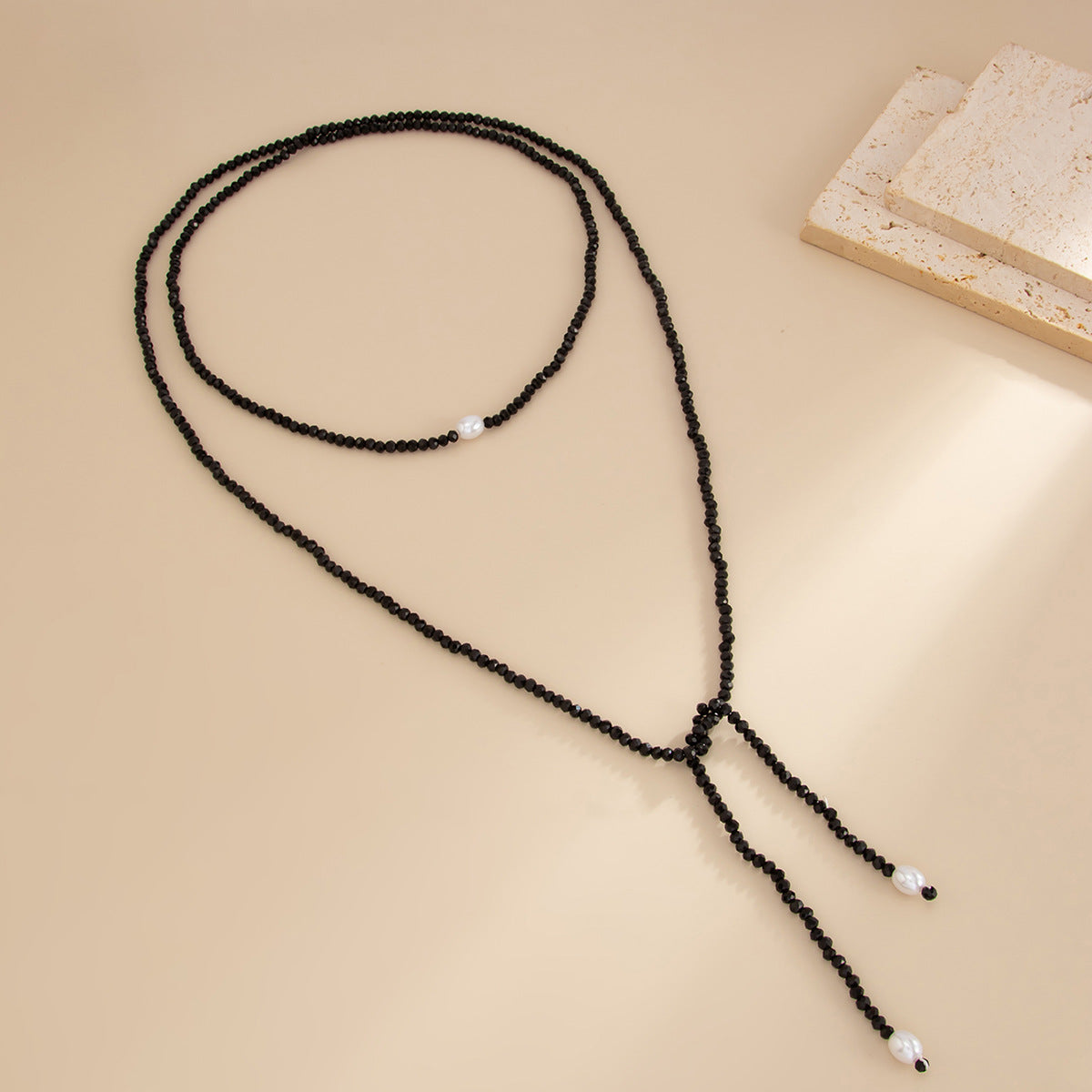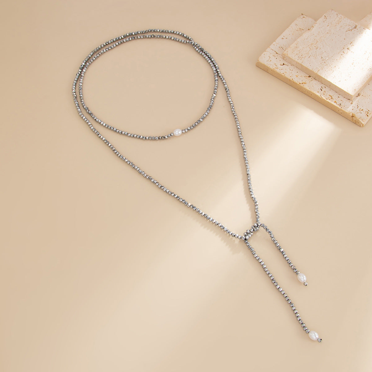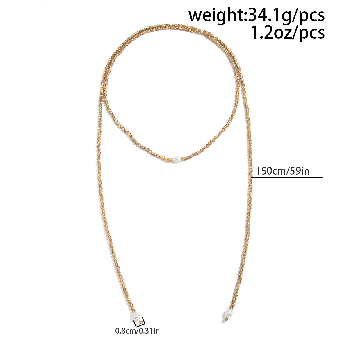 Este colar longo combina o brilho delicado do cristal com o toque clássico da pérola, criando um acessório elegante e versátil para complementar qualquer look. O seu comprimento generoso permite múltiplas formas de utilização, simples, duplo ou até em camadas com outras peças, tornando-o perfeito tanto para um estilo sofisticado como para um visual mais descontraído. Uma peça leve, cintilante e intemporal, ideal para transformar o dia a dia com um brilho subtil.