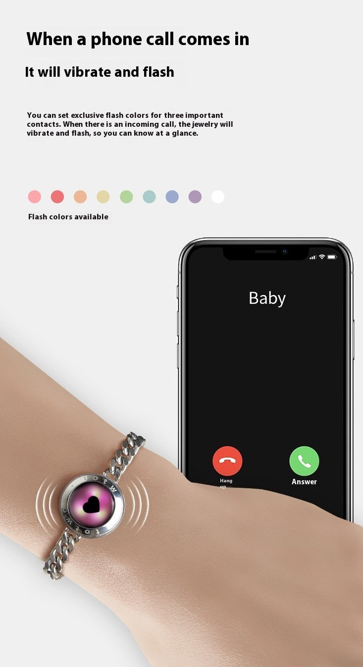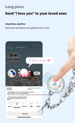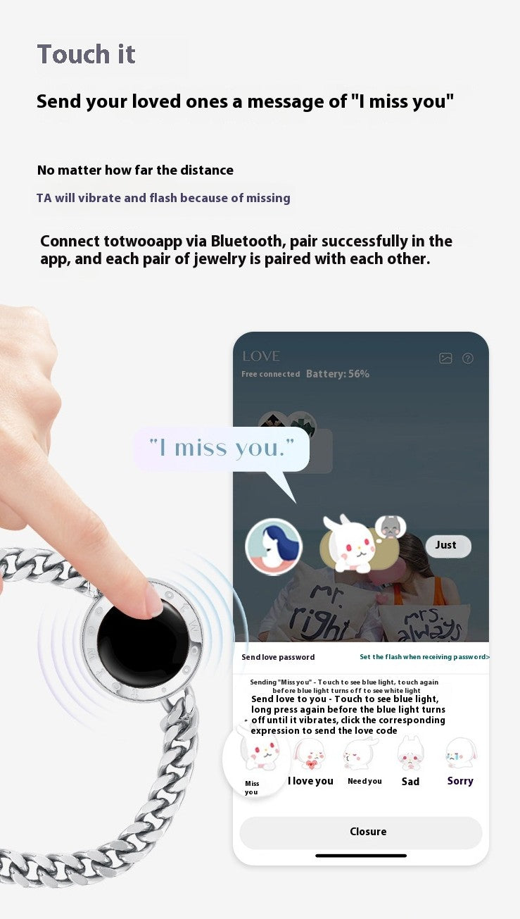 A pulseira de toque de longa distância foi criada para manter a ligação entre duas pessoas, independentemente da distância. Com um simples toque, a pulseira emparelhada vibra e ilumina-se instantaneamente, transmitindo uma sensação real de proximidade. Compatível com sistemas iOS e Android, permite uma comunicação discreta, imediata e sem limites.