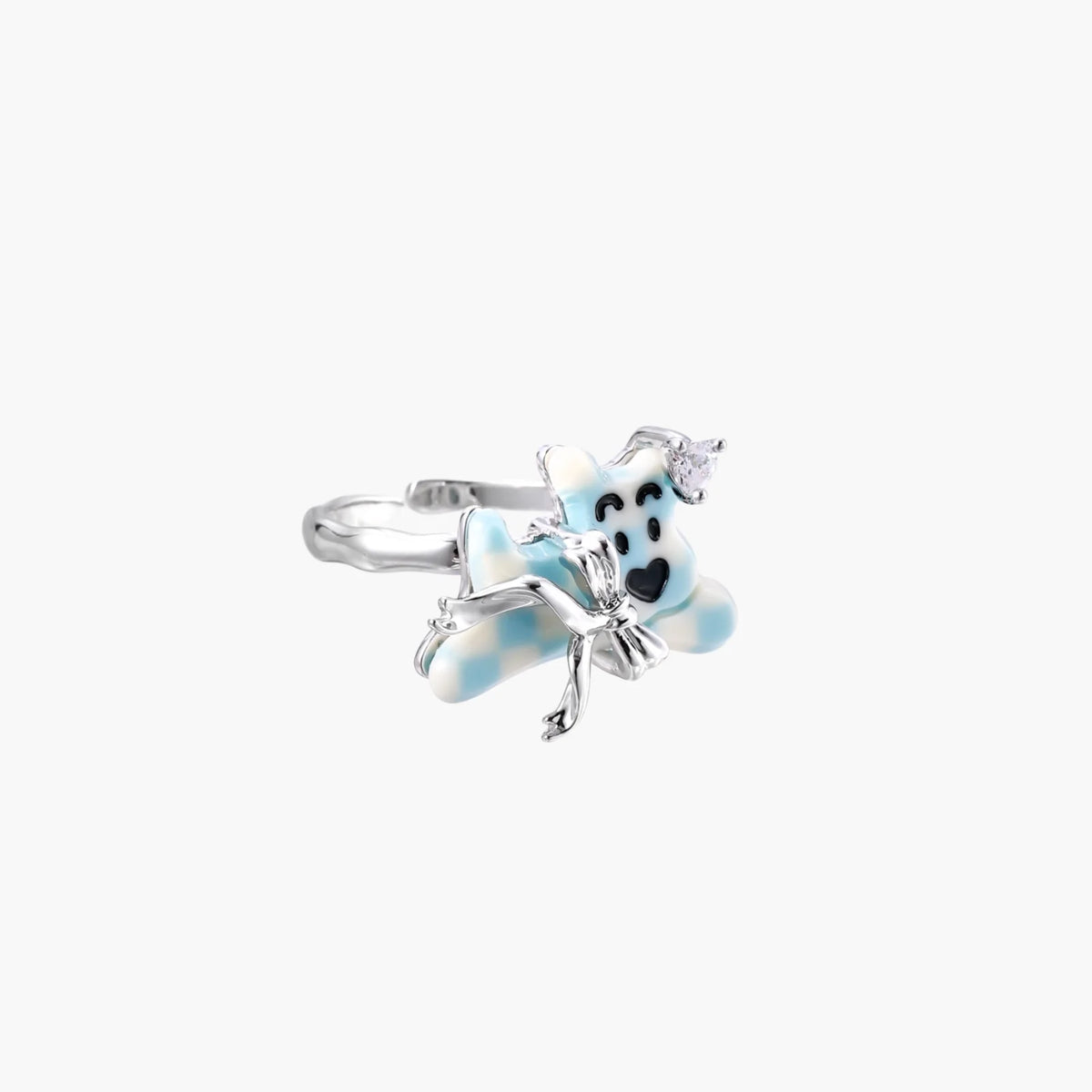 O latão banhado a ouro branco combina com esmalte azul pintado à mão neste anel divertido em forma de cãozinho com coroa, transmitindo a energia leal e encantadora de um fiel companheiro.