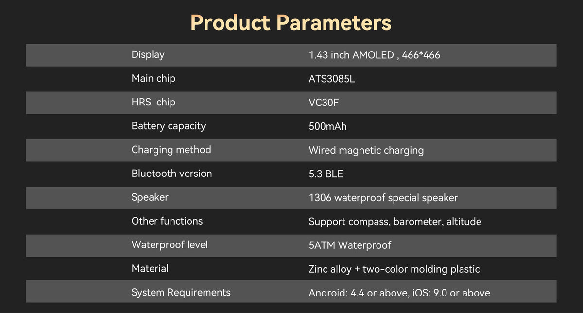 Ecrã: AMOLED 1.43" - Resolução 466 x 466 px
