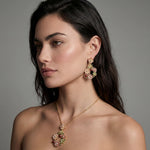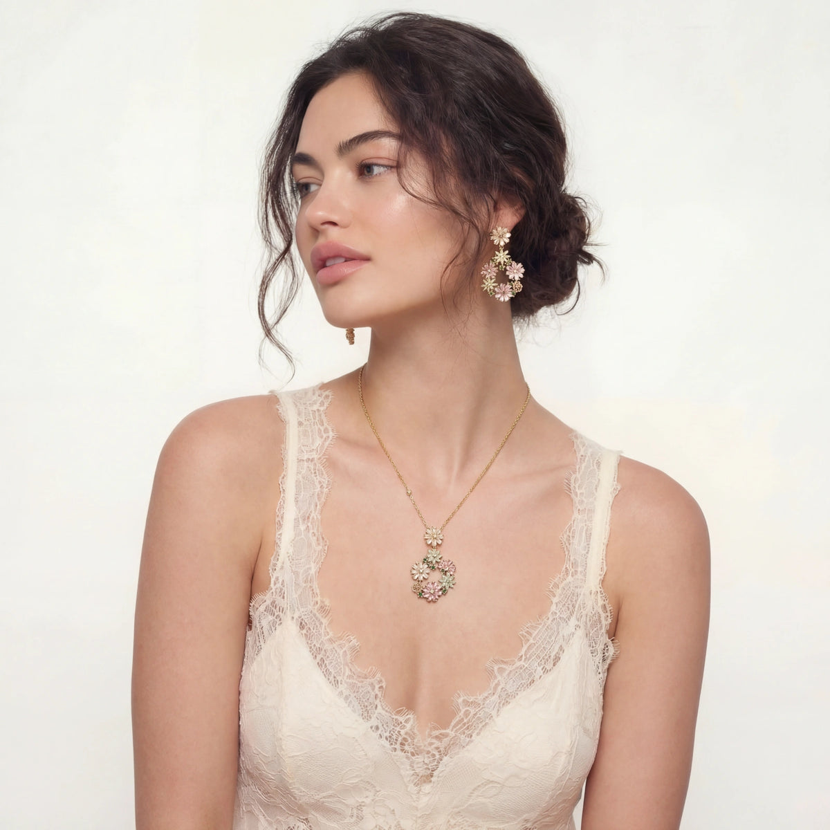 Delicadas flores em zircónia cúbica rosa suave e menta desabrocham sobre banho de ouro 14K, transmitindo confiança e calor.