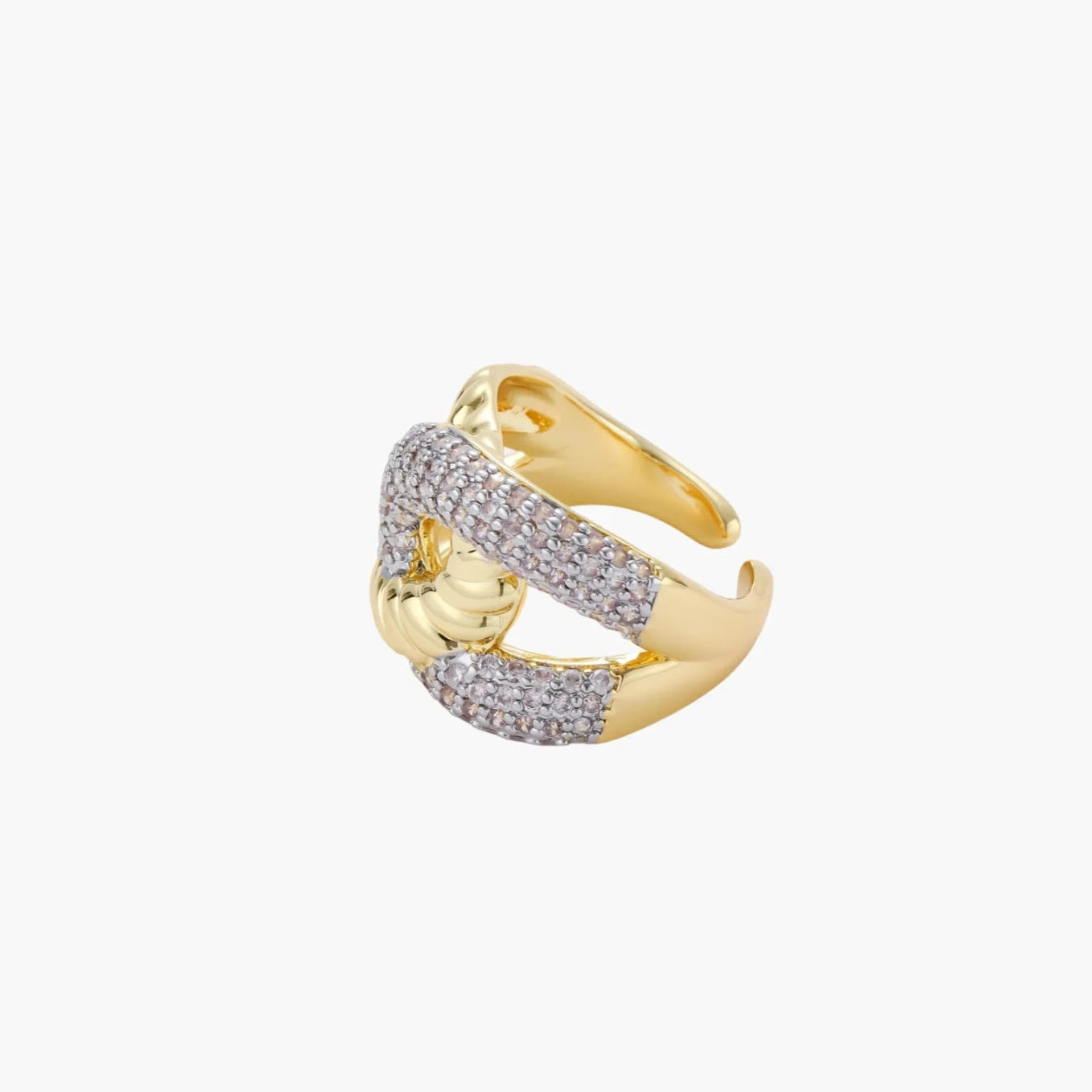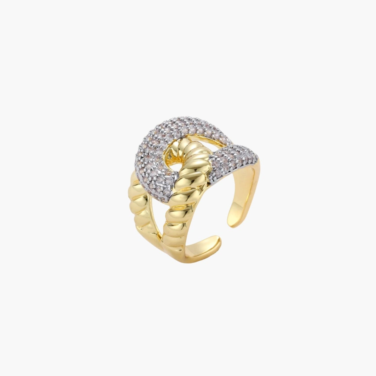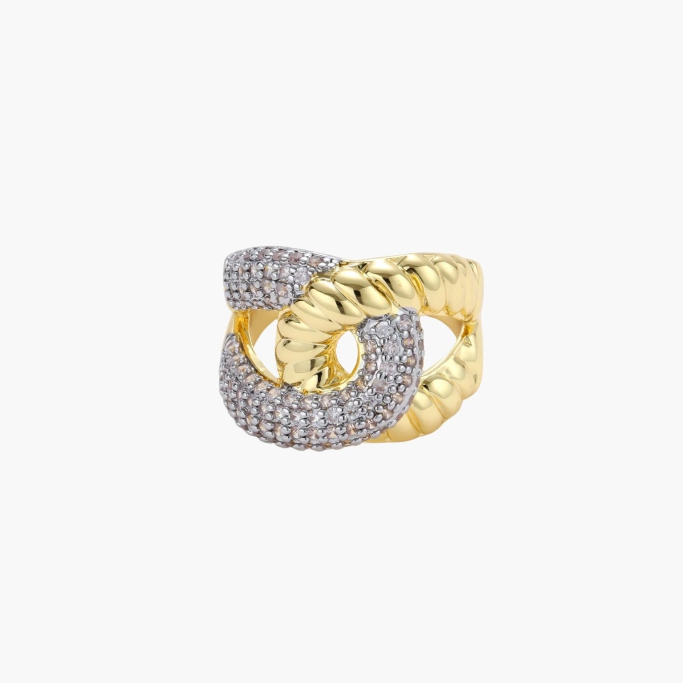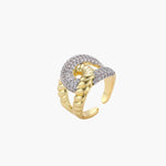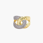 Um design ousado de elos correntes encontra o brilho cintilante da zircónia neste anel de destaque que transmite confiança e presença. As curvas geométricas criam uma energia forte e contemporânea, perfeita para visitas a galerias de arte ou para elevar até os momentos mais simples do dia com atitude.
