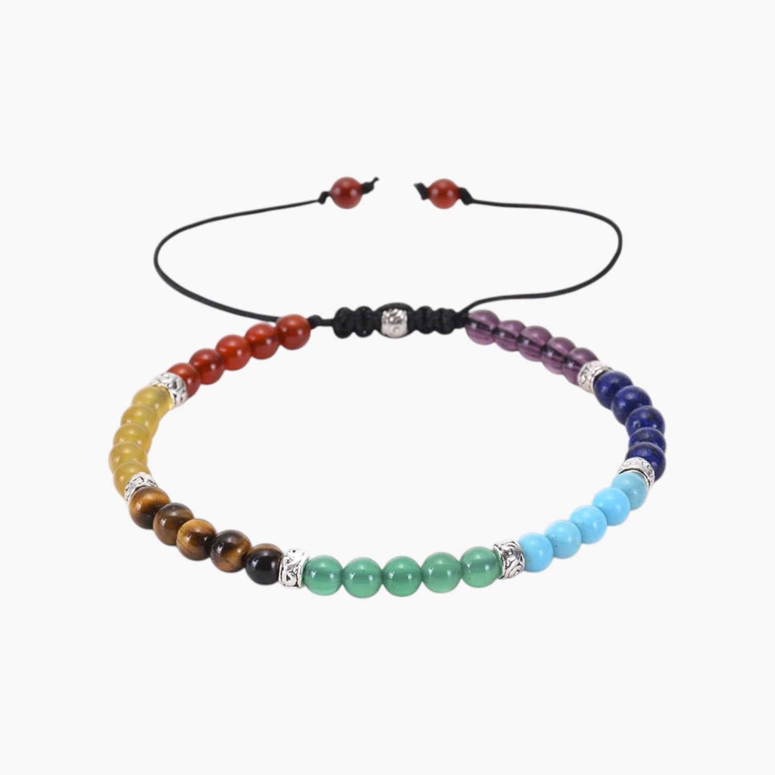 O acabamento simples e equilibrado realça a combinação das cores dos chakras, criando uma pulseira leve, simbólica e perfeita para expressar estilo e bem-estar.