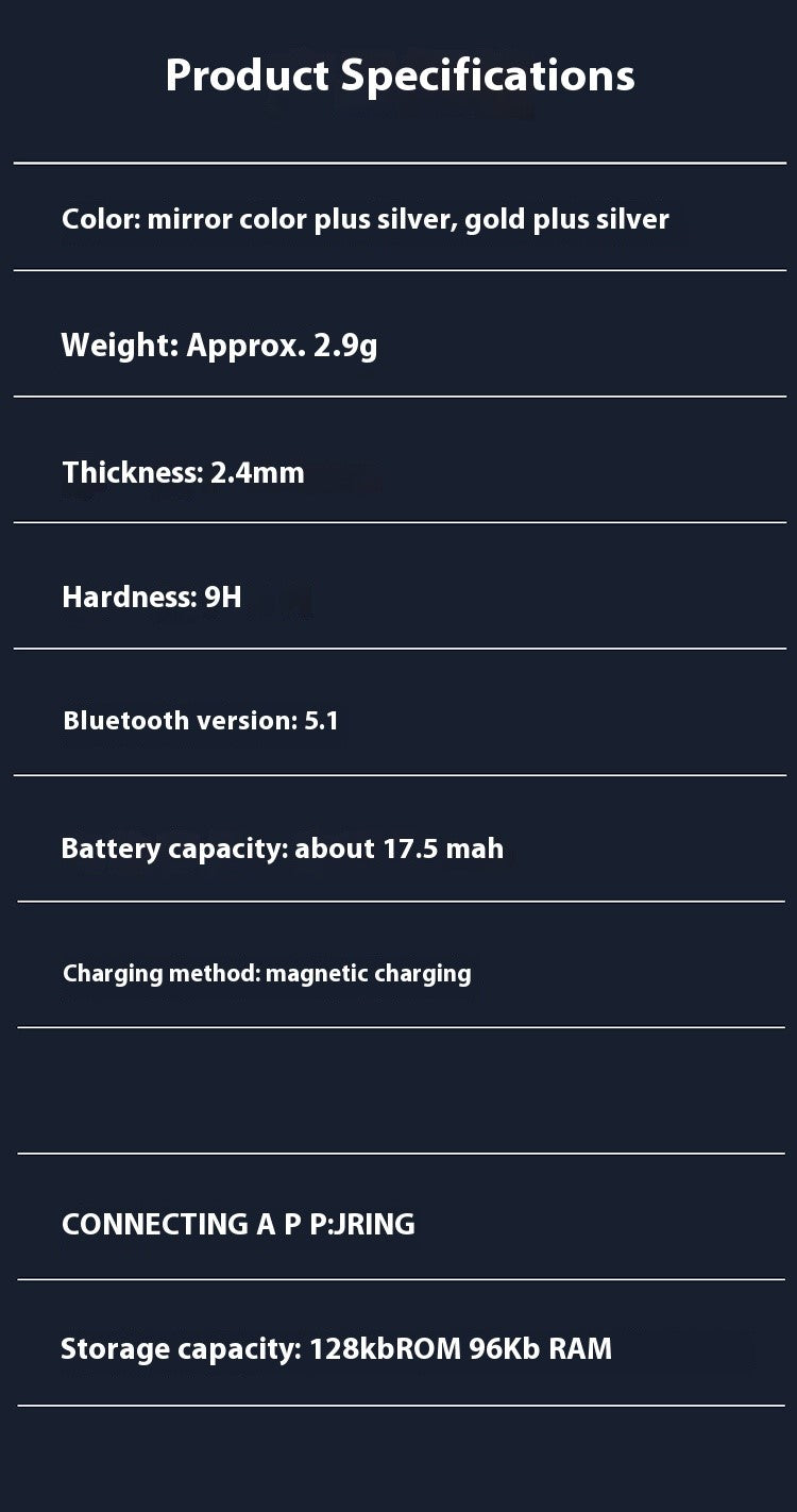 O Anel Inteligente combina tecnologia avançada com um design sofisticado, leve e confortável, tornando-se o acessório ideal para quem procura monitorização de saúde em tempo real e funcionalidades digitais inovadoras. Para além de acompanhar o bem-estar físico, este anel inteligente oferece controlo por gestos e funções adicionais que simplificam o dia a dia, mantendo sempre a elegância.