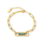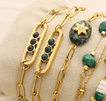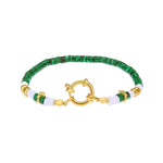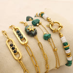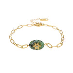 Esta pulseira de aço inoxidável é feita com pedras naturais de Malaquita, Turquesa, conhecidas por suas propriedades curativas. Ajustável entre 15,5 e 20 cm, seu belo e durável design em metal irá complementar qualquer estilo. Adicione um toque de energia positiva com esta pulseira única.