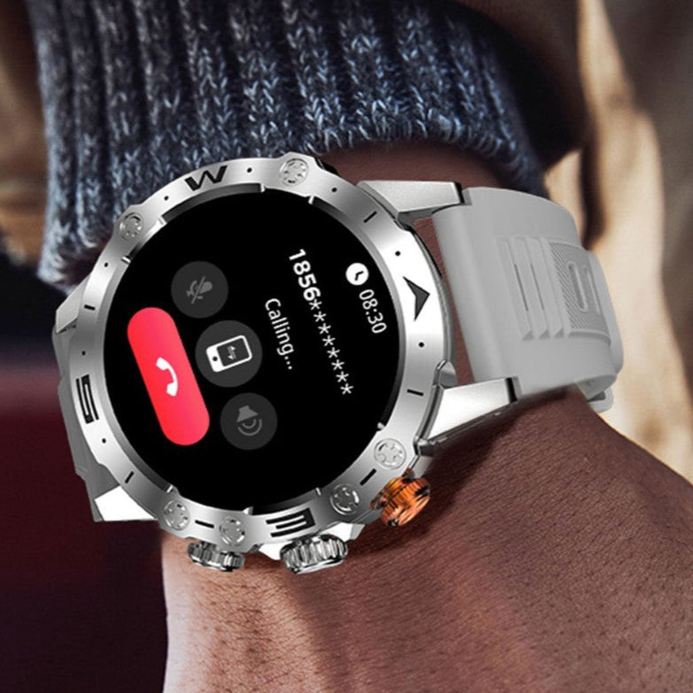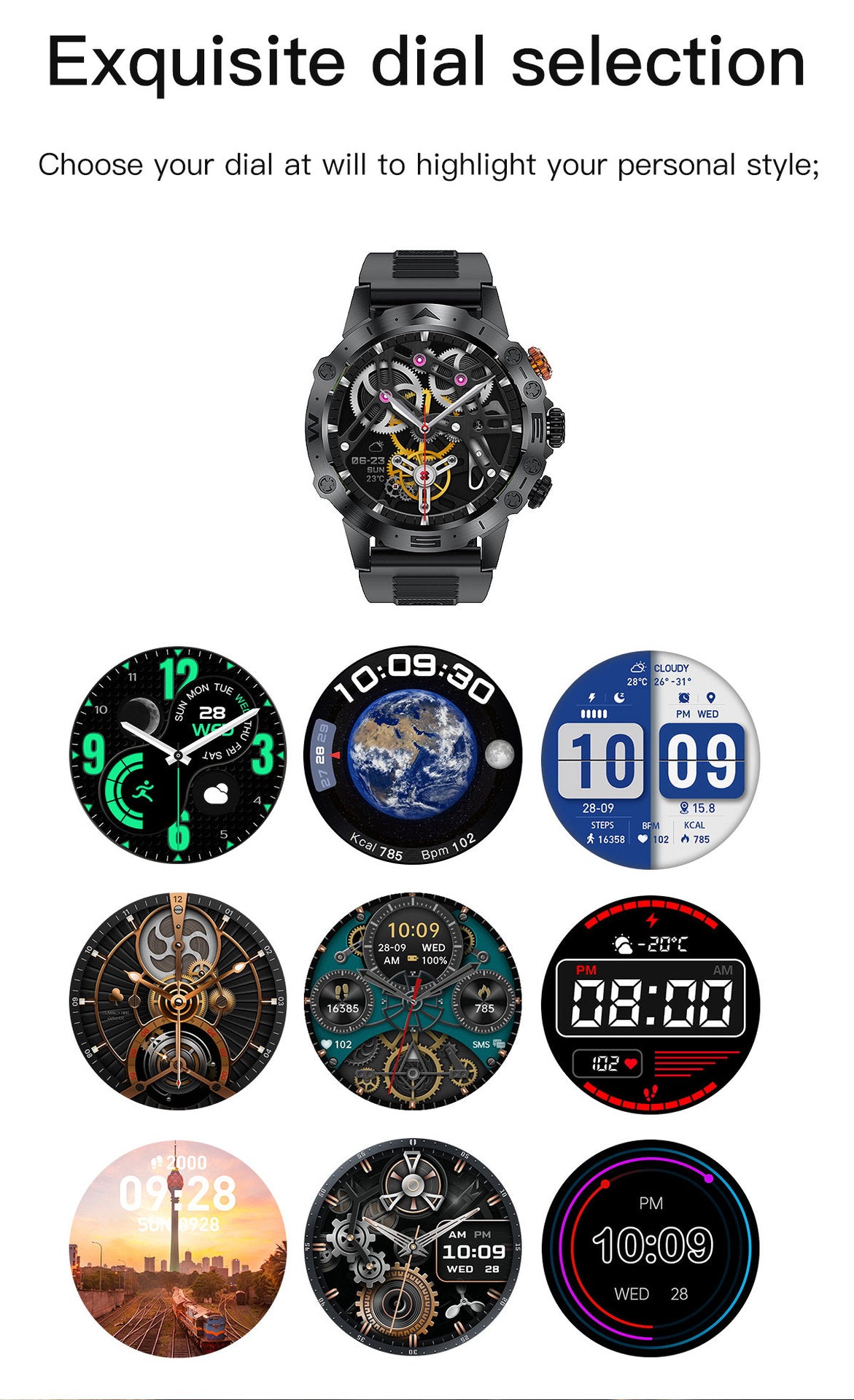 Este smartwatch multifuncional combina design robusto de inspiração militar, tecnologia avançada e funcionalidades práticas para o dia a dia. Com monitorização completa da saúde, chamadas via Bluetooth e mais de 100 modos desportivos, é o parceiro ideal para quem valoriza o bem-estar, o desempenho e o estilo pessoal.